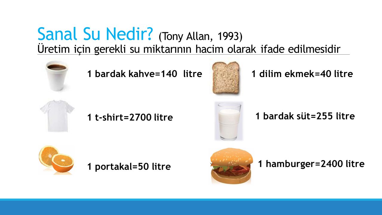140 litre su İngiltere’deki normal bir insanın bir günde içme ve ev ihtiyaçları için kullandığı suya karşılık geliyor. Bildiğimiz bir hamburgerin de hazırlanması için 2 bin 400 litre suya ihtiyaç var.Araştırmalara göre Amerikalılar her gün Çinliler’in üç katı yani 6 bin 800 litre Sanal Su tüketiyor.